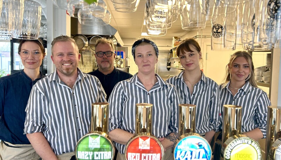 Välkomnar in. Idag klockan 11.00 öppnar Bangården Café & Bar. Från vänster: Michaela Rosgårdh, Andreas Engström, Tomas Gustafsson, Linda Wallén, Amanda Laakso Styf och Emilia Wistedt.
